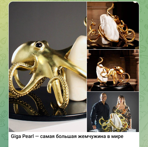 Сегодня Рейес не спешит продавать сокровище стоимостью около 90 миллионов долларов, а предпочитает показывать его публике в музеях и галереях по всему миру.Представьте себе жемчужину весом 27 килограммов! Она похожа не на украшение, а скорее на зуб динозавра. История находки тоже впечатляет: в 1959 году дед канадца Авраама Рейеса купил у филиппинского рыбака гигантскую ракушку в подарок дочери. Когда её раскрыли дома — внутри оказался сюрприз, который десятилетиями хранился в семье. В 2016 году жемчужина перешла к Аврааму по наследству. Чтобы подчеркнуть её необычность, нью-йоркский скульптор Бетани Кралл создала для Giga Pearl золотое обрамление в виде осьминога. Сегодня Рейес не спешит продавать сокровище стоимостью около 90 миллионов долларов, а предпочитает показывать его публике в музеях и галереях по всему миру. - Они созданы во времена, когда железо ещё не выплавляли.